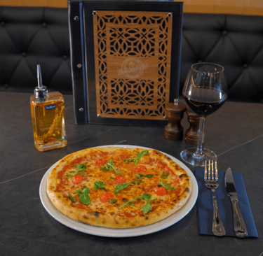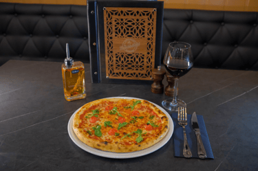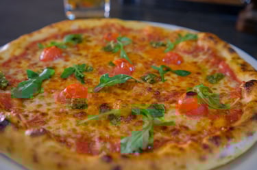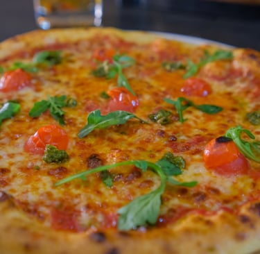 Sauce tomate, mozzarella, courgettes, légumes grillés, tomates cerise.
