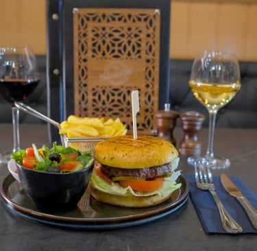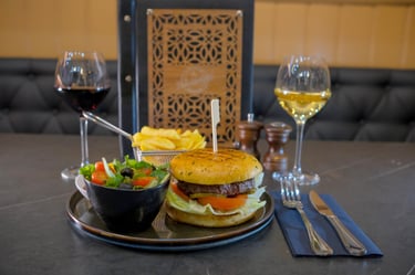 Galette de pommes de terre, cheddar, salade, tomate, oignon rouge, cornichons, sauce burger.