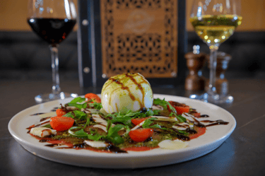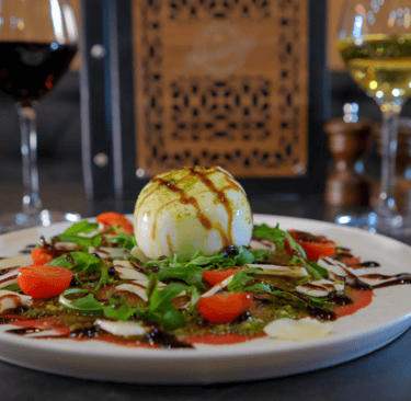 Fines tranches de bœuf, parmesan, burrata, tomates cerise.