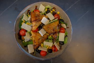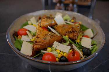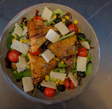 Salade, brick au chèvre, tomates cerise, miel, noix.