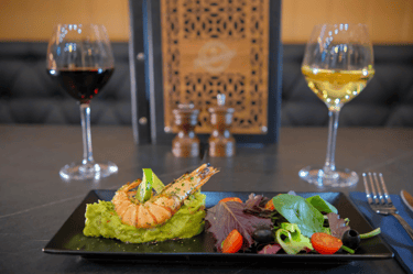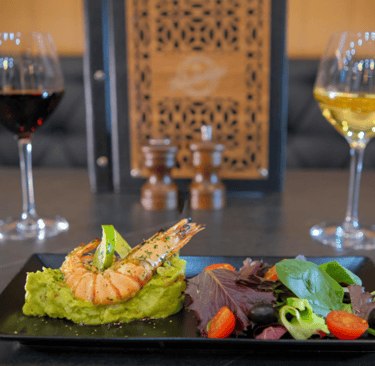 Avocat accompagné d’une sauce cocktail aux crevettes, gambas.