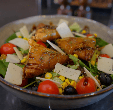 Salade, poulet pané, parmesan, œuf dur, sauce César.